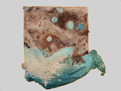 Le caractère spontané et "inévitable" de l'acte créatif revendiqué par le peintre de la période Tang Wou Tao Tseu et si souvent présent dans l'histoire de l'art Chinois, a guidé mon exécution très intuitive de paysages côtiers vus d'en haut inspirés de photo satellitaire. Travaillées au sol, les œuvres sont nées en observant et en travaillant les réactions organiques des matériaux tels que pigments, acrylique et huile de lin, pâtes à papier, etc, durant leur temps de séchage. Le processus créatif suit un parcours où la volonté et le hasard se répondent, le faire et le laisser faire s'accompagnent. L'utilisation de pigment photo-luminescent emmagasinant la lumière pour la restituer dans l'obscurité, m'a permis de travailler sur ce qui se voit, partie de ce qui est montré et d'évoquer ainsi la délicate question de la subjectivité de la perception et du respect dû à la diversité des points de vue.