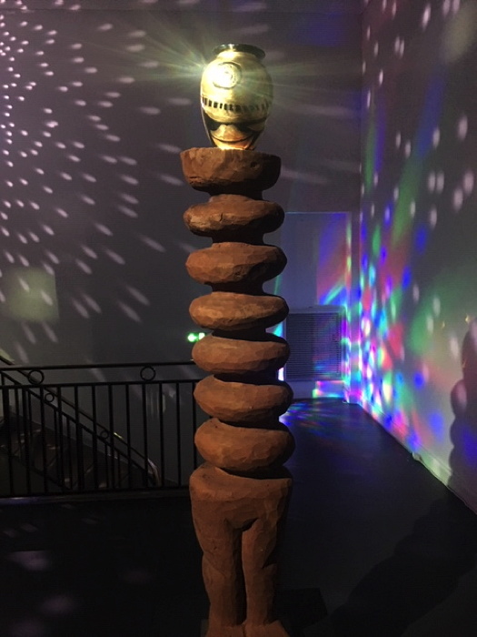 Ces trésors viennent de son travail effectué ces dernières années à Lisbonne et de ses constellations de formes et de matériaux récoltés au fil de ses voyages. Pyramide lumineuse, objets sous verre, peintures miniatures et grands formats, sculptures : grands totems de bois et de cuivre faits au Cameroun, et des ensembles de céramiques fabriquées au Portugal. Ces supports divers : peinture sur toiles ou kakémonos, installations et sculptures inédites investissent l'espace de cette ancienne banque de France transformée en centre d'art. Tout baigne dans une lumière stroboscopique dans la première salle. Ensuite il faut aller voir au sous-sol.