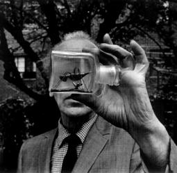 Joseph Cornell holding an Untitled Bottle Object, photograph by Duane Michals