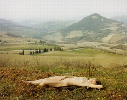 Alors, sans bien sûr percevoir devant ces grandes photographies couleur un hommage appuyé à Gaspar David Friedrich - Der Wanderer, 2003 - souvent d'ailleurs cité plus ou moins justement par nombre de photographes de paysages, sans oser non plus comparer les vues de dos dénudé aux sorties du bain de Degas, ni même aux autoportraits au miroir de Bonnard et Vuillard et encore moins à la première odalisque, Nu endormi, 2003, telle que Giorgione avait su la peindre tout en bouleversant la hiérarchie des genres, hissant le paysage comme sujet à part entière dans une peinture italienne encore emprise aux grandes fresques religieuses, politiques ou mythologiques, il est ici question de mise au silence de l'identité pour une mise en scène de la figure féminine. Et c'est alors que le mot même de figure, reprend une de ses significations premières : être la représentation d'une forme extérieure et donc pouvoir être par extension rhétorique l'allégorie de la femme. En effet, les photographies d'Elina Brotherus, nous parlent "en figure" de la femme dans le paysage, dans son univers. Paysage de la nature qu'elle contemple de dos, laissant ses pensées partir au loin, s'immergeant dans cet espace qui l'englobe et qu'elle laisse pénétrer en elle, mais aussi paysage de son quotidien, assise à une table où quelques pommes échappées d'une nature morte hollandaise semblent la laisser indifférente ou tout au moins songeuse. Parfois, c'est recroquevillée sur le bord du lit, ou cadrée dans un enlacement douceureux dont les mains justes nous disent le souvenir qu'elle se met en scène et s'offre pudiquement à l'objectif dont on devine parfois la présence par le fil du retardateur qu'elle actionnera elle-même.