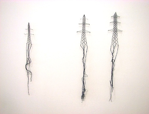 Une photo. Elle est là, debout, la tête abaissée, observant son ventre rond et les trous béants dans sa nuisette de satin. Ce n'est pas sa chair qui y apparaît mais un étrange amas de tissus sombres, comme une maladie qui aurait à la fois gonflé et rongé ses entrailles. Le même type de dégénérescence se reproduit sur un tapis poilu, mort au milieu de la pièce. Trois bosses dodues apparaissent à sa surface, cachées par la tonsure, et semblent prêtes à libérer quelques ovoïdes créatures. Petit à petit, les murs blancs et lisses de la galerie sont envahis de pustules de tissus vert. Ils s'installent dans les coins, s’extirpent progressivement du plafond, finissent par traverser une paroi et explosent l'assise d'une chaise pour voler la place à quiconque voudrait s'y reposer. Il eut en effet été bon de s'asseoir pour respirer un peu et compter le temps sur ce boulier constitués de petits chignons crêpés, une dégoûtante collection de cheveux roux arrachés. Une blanche et molle forme en feutre nous observe de son trou obscène et semble vouloir nous supplier de ne pas la menotter comme ses noirs congénères pendus de l'autre côté de la pièce. Tout dégénère, même le peu de souvenirs du réel. Les grilles, les pylônes, les cheminées d'usine, les délicates architectures en dentelle se transforment en radicules anarchiques et semblent définitivement condamner tout rationalisme.