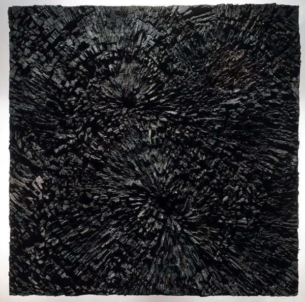 Nées de la communion entre l'homme et la nature, les sculptures en bois d'Edouard Faro expriment "la fulgurance de l'émotion". Le sculpteur montheysan travaille différentes essences de bois (3) qu'il sculpte, hache, scie, martèle, frappe, façonne, polit jusqu'à en révéler les plus subtiles nervures. Dans son corps à corps avec le végétal, il renoue avec un langage primitif en privilégiant des formes pures d'une grande force expressive : "Je retiens le moment où ça va lâcher ; celui qui donne l'énergie. […] Chaque pièce est un éloge de la fragilité." Selon un même attrait pour la sensualité des matériaux, les toiles de Pierre Zufferey issues de la série L'Ecume des jours (2011) traduisent sa recherche constante autour de la matière picturale, de la puissance chromatique, de la lumière, de la transparence et de l'énergie gestuelle. Il nous convie à nous laisser happer par ses grands formats tour à tour sombres ou limpides, constellés de concrétions colorées ou ponctués d'aplats apaisés. Ces deux artistes trouvent dans leurs œuvres le juste équilibre entre expressivité organique et construction rigoureuse. Brèche, cassure, éclat, éclisse, esquille, entaille, faille, fêlure, fragment, rupture… Edouard Faro écorce, nettoie, élimine les parties putrescibles des grumes qu'il fend ensuite en quartiers avant de les faire sécher durant plusieurs années. Tout son travail est défini par le bois de tête (4), au maximum de sa résistance. Il "décortique" l'arbre, le débite en suivant les cernes (5) de croissance jusqu'à trouver son cœur. En dénudant celui-ci, en en dégageant les veines, il prête aux blocs massifs l'animation d'un épiderme humain, vivant et fragile au sein de la masse inerte. Telles des empreintes digitales, les veinures rappellent ces lignes inscrites sur notre peau. Comme pour remonter le temps et renvoyer à un état primitif de la matière, l'artiste s'attache à ouvrir chaque cerne jusque-là imperceptible. Il honore le matériau vivant en exhumant la forme que ce dernier est susceptible de recéler ou d'engendrer. Cette manipulation végétale se mue en une quête existentielle : "Chaque ouverture est particulière et m'ouvre à moi-même." (6) Ici viennent exploser les impulsions, les pulsions, les énergies comprimées qui font naître ces sculptures d'une densité extrême. Ce processus créateur nécessite une technique précise. L'immense difficulté consiste à ouvrir le bois avec des saignées, sans qu'il éclate totalement. Le choc (7) donné est alors déterminant pour que la forme émerge lentement, selon un procédé généré par une force viscérale. Grâce à un travail lent et délicat, l'artiste se laisse guider par le dessin naturel de son matériau qu'il prolonge artificiellement, en en soulignant le mouvement (8). Faro rejoint ainsi une ancienne conception de la Renaissance et de Michel-Ange en particulier, selon laquelle le sculpteur pressent et révèle la forme déjà contenue dans le matériau. Tel un peintre qui au cours de son Action painting découvre lui-même la structure qu'il va explorer, Edouard Faro se livre au rythme du bois plus ou moins docile, malléable ou résistant. Chaque essence impose sa propre ligne. A chaque fois, l'artiste doit s'abandonner pour fixer l'énergie de manière légère en trouvant l'accord entre structure et déstructuration, pesanteur et grâce, équilibre des tensions dans la fragilité du moment. Telles des compositions musicales, ces blocs de bois rythmiquement organisés s'élaborent selon des scansions, des répétitions de cadences et de brisures. Il en est de même pour le peintre Zufferey qui, aimant telle "une musique le son de la brosse sur la toile" (9), joue sur les tempos, les gammes de tons sourds et les pulsations. (illustration 1) Peu à peu, le matériau se prête au travail du sculpteur, l'œuvre se façonne. Sous les chocs de l'élégant marteau japonais de Faro, le Western Red Cedar perd sa dureté et son apparente rigidité ; il s'attendrit petit à petit. Eclatées, explosées, ses fibres s'entrechoquent et se muent en chardons géants échevelés et barbus, aux dents épineuses et acérées ; en plantes vivaces montagneuses d'aspect coriace et luisant, aux capitules argentés. Ces carlines épanouies si avides de soleil qu'elles en ont pris la forme s'apparentent à une constellation d'astres à la surface vibrante, à des arbustes solaires, dans un déploiement d'innombrables rayons. (illustration 2) Les fibres hachurées et nerveuses des sculptures en cèdre (10) impulsent quant à elles une toute autre rythmique : obstinées, tourmentées et sèches, elles font vibrer, crépiter la matière. Le réseau très graphique de halos sombres semble palpiter et faire jaillir d'étranges spirales nébuleuses qui s'enroulent sur elles-mêmes, rayonnant d'énergie cosmique en volutes. (illustration 6) Tel un rappel de la chaleur solaire, le feu appose son empreinte sur certaines pièces. Une fois brûlé, le cèdre (11) se change en lit de rivière, dansant, rythmé par de grandes ondes qui parcourent la surface ravinée et veinée. Edouard Faro renoue ainsi avec l'âme du bois flotté échoué sur la grève ou avec les forces fluviales érodant la roche. La plasticité du végétal calciné devient l'élément malléable idéal pour être modelé. (illustration 3) Parfois couvertes d'un noir (12) épais et poudreux, les œuvres de l'artiste s'imposent par leur autorité, leur gravité et leur radicalité. Ses "sculptures de nuit" dont la matière a été arrachée, évidée violemment fonctionnent sur les jeux d'ombre inhérents à leur structure : intenses et ténébreuses, elles semblent flotter, se mouvoir mystérieusement. Le raffinement du noir atténue les profondeurs et unifie les nuances naturelles du bois (13) tout en soulignant la puissance obsédante des rythmes. Noble, il révèle une palette infinie de teintes qui va du solaire brillan