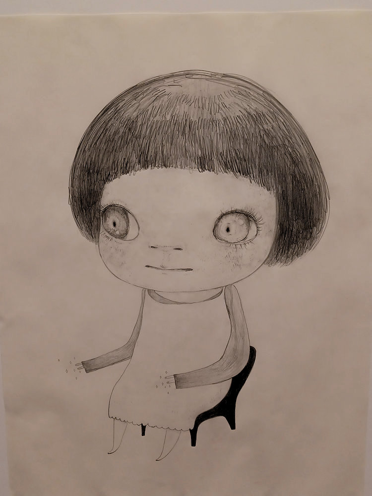 L'exposition All My Little Words à l'Albertina modern se concentre sur les multiples facettes de l'œuvre dessinée de Nara, qui s'est développée sur une période d'une quarantaine d'années. L'exposition va des premiers travaux expérimentaux sur papier et d'un certain nombre de peintures et de sculptures à une vaste installation. Les dessins, qu'il griffonne parfois avec désinvolture sur des bouts de papier, des enveloppes, des prospectus ou du carton ondulé, montrent l'influence directe de la musique, de la littérature, de la subculture et culture pop. La maîtrise du dessin de Nara se manifeste dans la richesse d'un spectre émotionnel, allant de la vulnérabilité à la profondeur existentielle, en passant par la rébellion et l'indiscipline. Nara a grandi dans le nord du Japon. Il a obtenu une maîtrise à l'université des arts d'Aichi en 1987. Il a poursuivi ses études à la Kunstakademie de Düsseldorf de 1988 à 1993, avant de s'installer à Cologne en 1994. Cette période a eu une influence déterminante sur Nara, qui a commencé à synthétiser la culture populaire japonaise et occidentale. Simona Nichiteanu